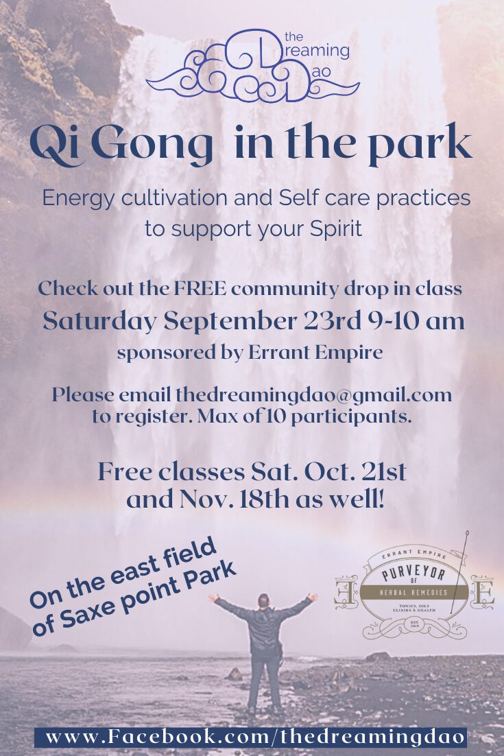 The Dreaming Dao is offering Qi Gong at Saxe Point sponsored by Errant Empire. The first 10 sign ups are FREE.