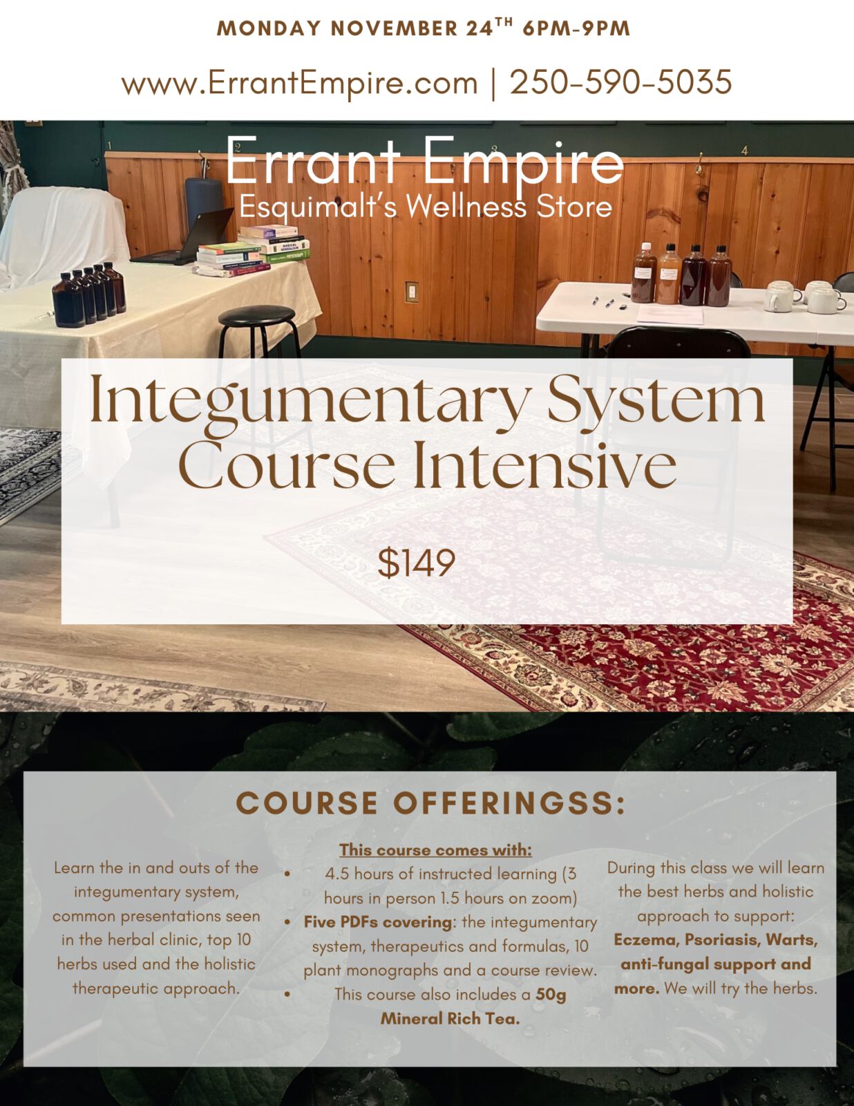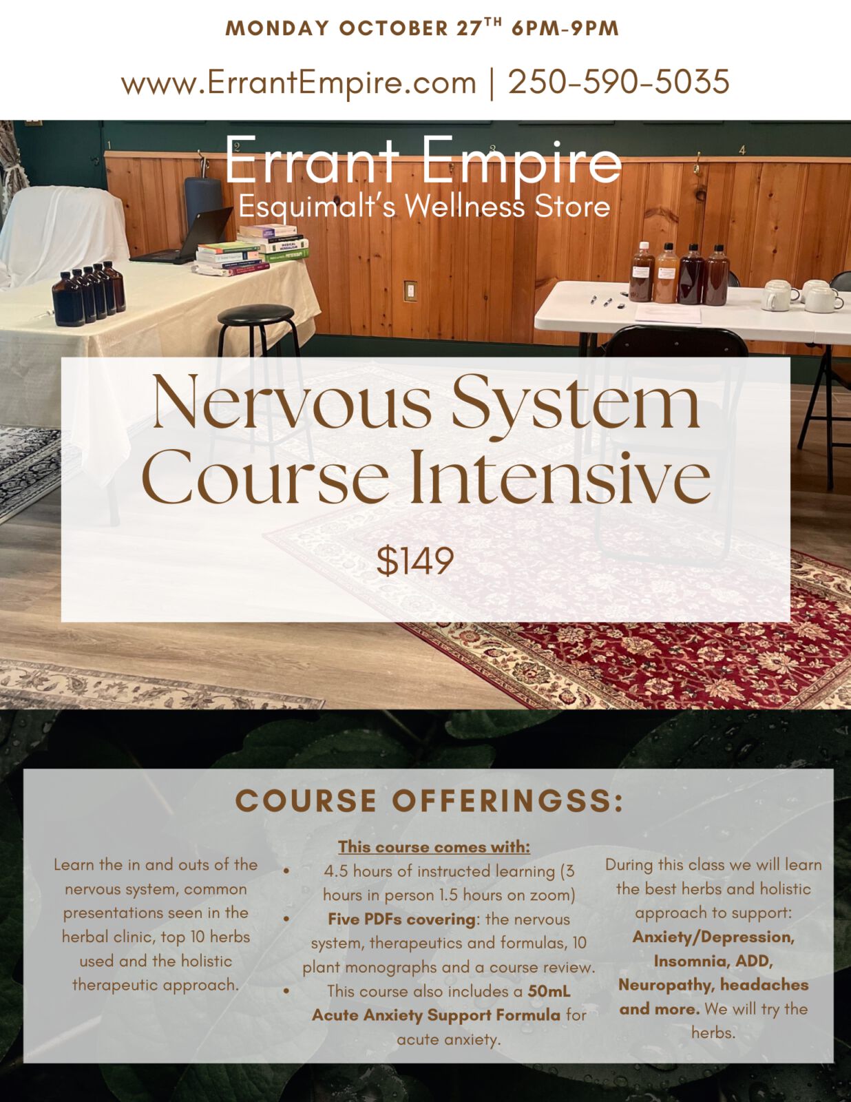 🌿 Nervous System Course Intensive 🌿 📅 Tuesday, October 28th🕕 6:00 PM – 9:00 PM📍 Errant Empire – Esquimalt’s Wellness Store💲 $149 Take a calm, comprehensive look at the nervous system and discover holistic herbal strategies for stress, sleep, mood, focus, and nerve health. ✨ What You’ll Receive:✔ 4.5 hours of instructed learning (3 hrs […]
